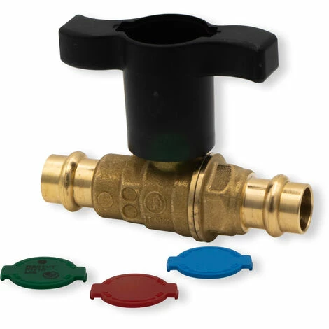 GIACOMINI Press-Kugelhahn für Kupfer-, Edelstahl- bzw. C-Stahlrohre – 15 mm x 15 mm – voller Durchgang – beidseitiger Pressanschluss – max. 100°C / 35 bar – mit verlängertem T-Griff aus schlagfestem Kunststoff – inkl. blauem, rotem und grünem Inlay – (Pressbacke mit Kontur V, M oder SA verwenden!)