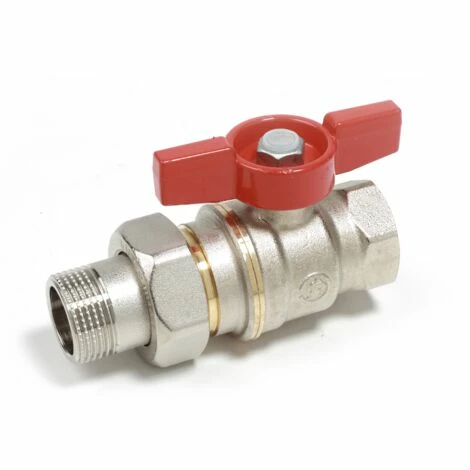 Kugelhahn mit rotem Flügelgriff und lösbarer Verschraubung. Schwermodell, MS58-Messing vernickelt. DADO-Kugelhahntechnik.